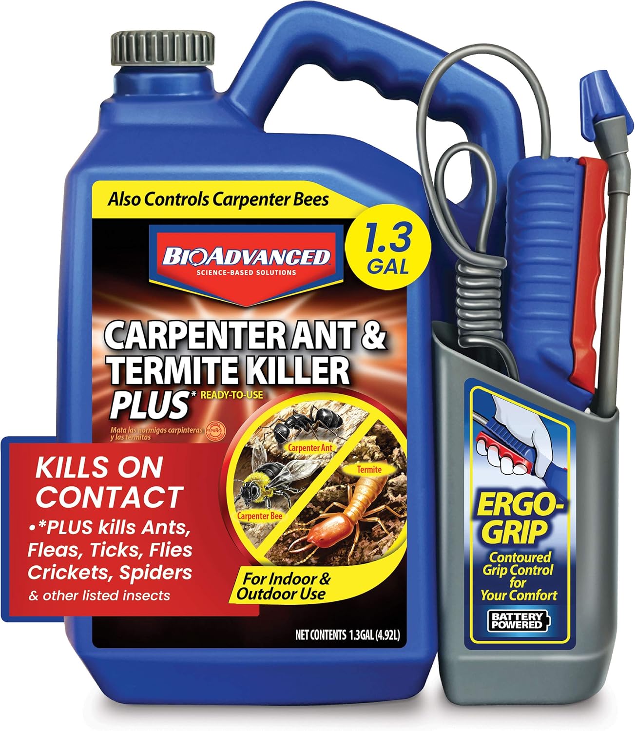 BioAdvanced Carpenter Ant Termite Killer Plus Kills On Contact Controls listed wood-infesting stinging crawling and flying insects. Can be used on lawns landscapes foundations decks patios wood piles and wooden elements in basements crawl spaces attics decks fencing and other listed areas. Gets in hard to reach areas with ease.