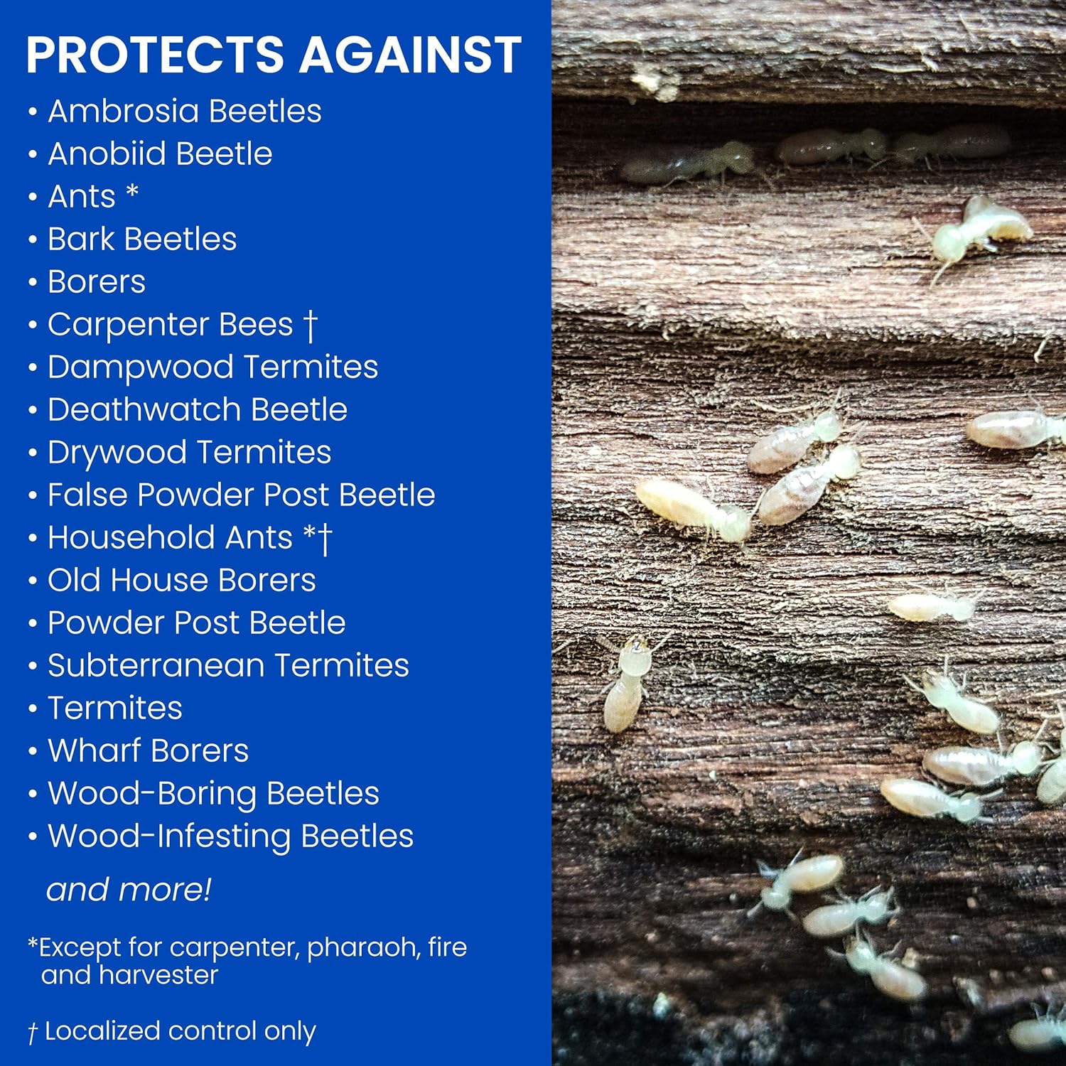 The termite killer kills the termites you see and the ones you dont. PLUS kills Ants 2 wood-infesting Beetles and other listed pests. Plus kills other wood-infesting insects including carpenter bees ants beetles and more.