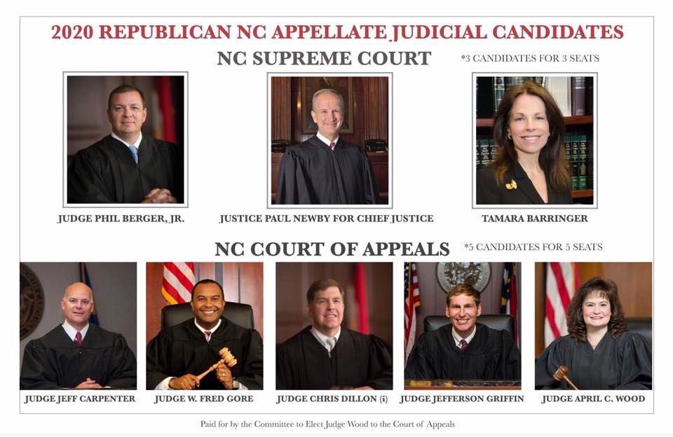 RALEIGH Republican judges took all five available seats on the NC. The five Republicans are April Wood a Davidson County district court judge. I was an in the courtroom Trial Court attorney for 13 years trying hundreds if not more than a thousand cases to verdict or final judgment in the District.